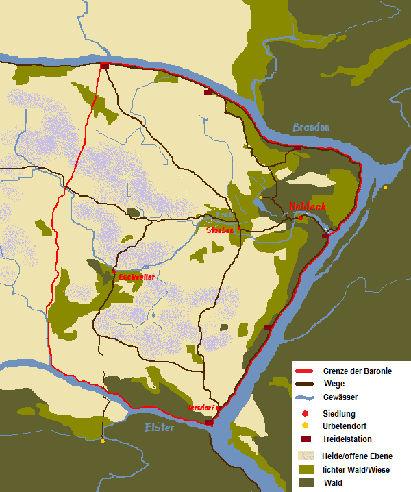 Heideck, der Sitz der Baronie, liegt im Nordosten, etwas eingerückt vom Flussufer des Brandon an den Gestaden der Esch, dem wichtigsten Wasserlieferanten dieser Heidegegend. Heideck besteht aus einer Holzfeste mit Wirtschaftshäusern sowie einem angrenzenden Weiler mit Handwerkern und Viehzüchtern.