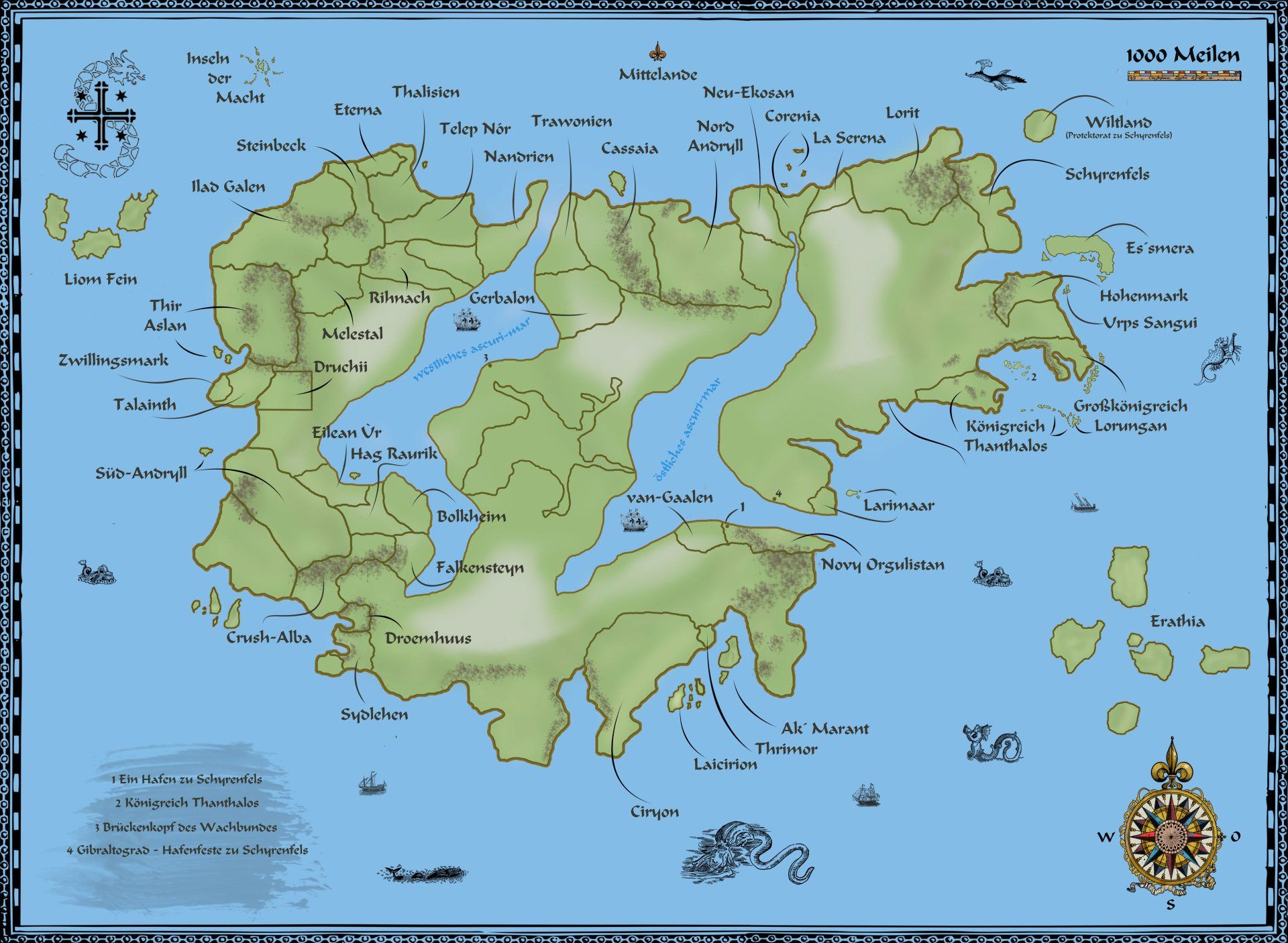 Das Fürstentum Rihnach liegt im Nordwesten der Südlande und erstreckt sich über knapp 1000 Meilen in Ost-West-Richtung. In Nord-Süd-Richtung beträgt die breiteste Ausdehnung etwa 400 Meilen im Westen, während es sich gen Osten trichterförmig verjüngt. Dort, wo das Land an das obere Binnenmeer stößt, beträgt die Breite gerade einmal 100 Meilen.